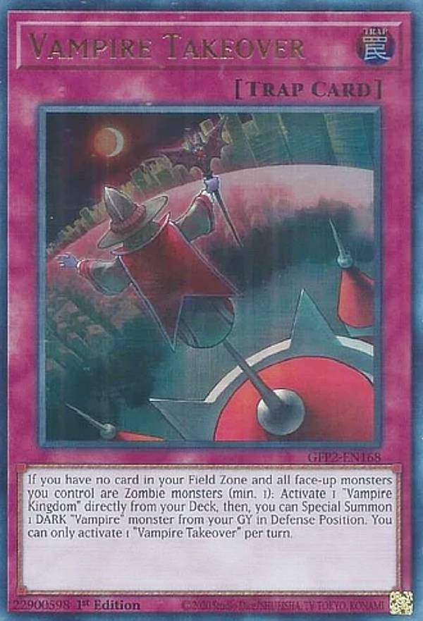 | カードテキスト | 自分のフィールドカードゾーンにカードが存在せず、自分フィールド上に表側表示で存在するモンスターがアンデット族モンスターのみの場合に発動できる。デッキから「ヴァンパイア帝国」1枚を選んで発動する。その後、自分の墓地から「ヴァンパイア」と名のついた闇属性モンスター1体を選んで表側守備表示で特殊召喚できる。「ヴァンパイア・シフト」は1ターンに1枚しか発動できない。 |