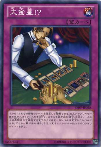 | カードテキスト | 1から12までの任意のレベルを宣言して発動できる。お互いのプレイヤーはそれぞれコイントスを1回行い、どちらも表が出た場合、自分フィールド上に表側表示で存在する全てのモンスターのレベルは宣言したレベルになる。どちらも裏が出た場合、自分は宣言したレベルの数×500ライフポイントを失う。 |