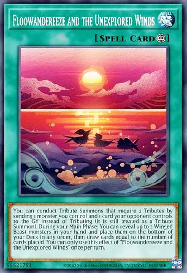 | カードテキスト | このカード名の②の効果は1ターンに1度しか使用できない。①:このカードが魔法&罠ゾーンに存在する限り、自分がモンスター2体のリリースを必要とするアドバンス召喚をする場合、モンスター2体をリリースせずに自分フィールドのモンスター1体と相手フィールドのカード1枚を墓地へ送ってアドバンス召喚できる。②:自分メインフェイズに発動できる。手札の鳥獣族モンスターを2体まで相手に見せ、好きな順番でデッキの一番下に戻す。その後、自分は戻した数だけデッキからドローする。 |