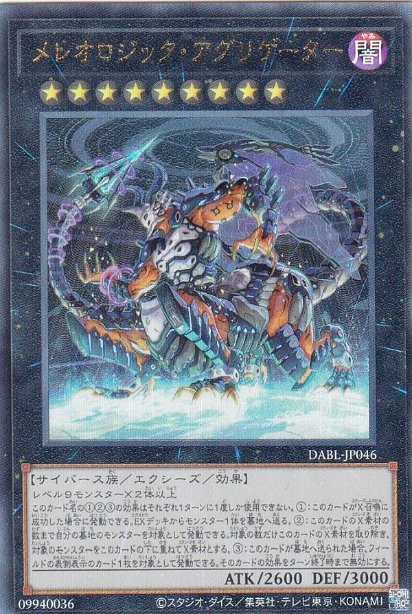 | カードテキスト | レベル9モンスター×2体以上 このカード名の①②③の効果はそれぞれ1ターンに1度しか使用できない。①:このカードがX召喚に成功した場合に発動できる。EXデッキからモンスター1体を墓地へ送る。②:このカードのX素材の数まで自分の墓地のモンスターを対象として発動できる。対象の数だけこのカードのX素材を取り除き、対象のモンスターをこのカードの下に重ねてX素材とする。③:このカードが墓地へ送られた場合、フィールドの表側表示のカード1枚を対象として発動できる。そのカードの効果をターン終了時まで無効にする。 |